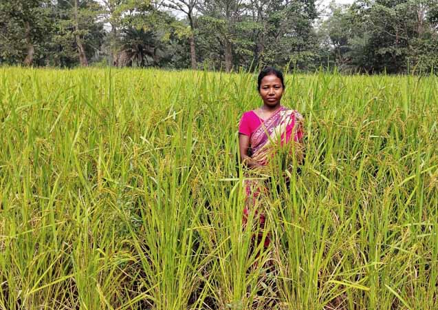 Sundari Mandi from the Khardbona Adivasi Rilamala Mahila Samiti has cultivated the deshi paddy variety Jhingashal. The crop shows healthy growth